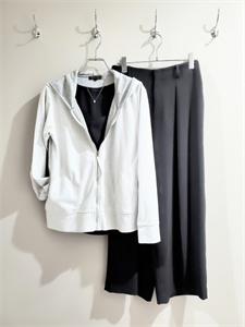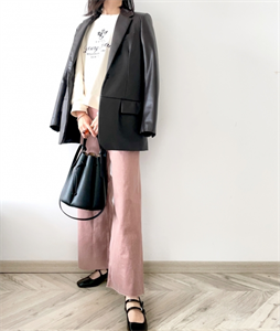 - ショート丈アウター:ワイド・バギーどちらにも合い、すっきりしたスタイルに。腰位置が高く見えて脚長効果も抜群。